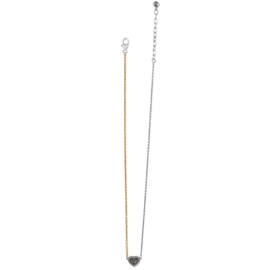 Inspired by the mystique of Neptune, this delicate silver and gold heart-shaped pedant necklace uses the familiar two-tone “rings” to create a pillow shaped “woven” design. Fine crystals adorn the perimeter – imbuing a classic refined quality.