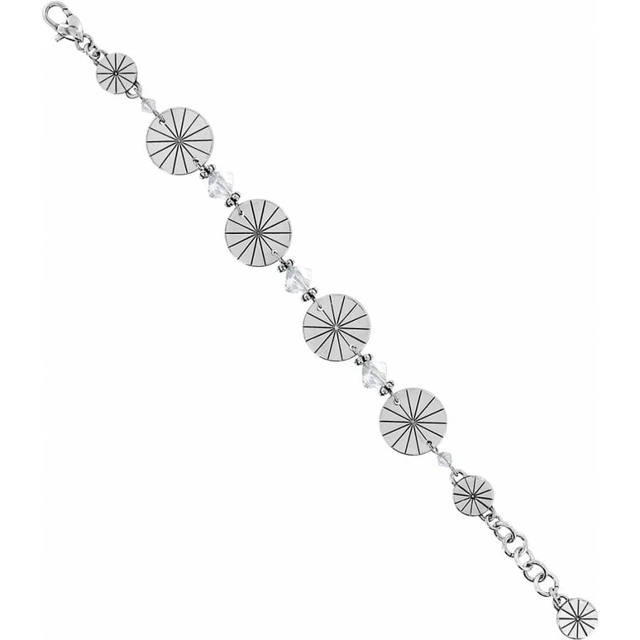 Large and small disks etched with spoke like lines orbit the wrist with celestial grace. Great for layering, this women’s bracelet easily transitions from a casual to dressed up look.