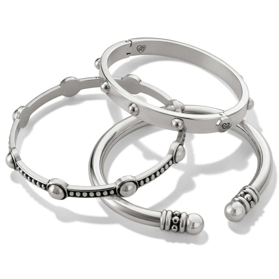 Silver studs punctuate this brushed silver bangle — a great complement to all of our Pretty Tough Collection pieces, but also chic on its own. Hinged, making it extra easy to wear.